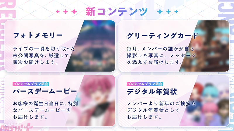 本プランは、特定のメンバーをより深く応援したい方に向けた内容で、各プラン名はメンバー本人が考案したものとなっております。プレミアムプランに加入された方には、限定特典をお送りします。