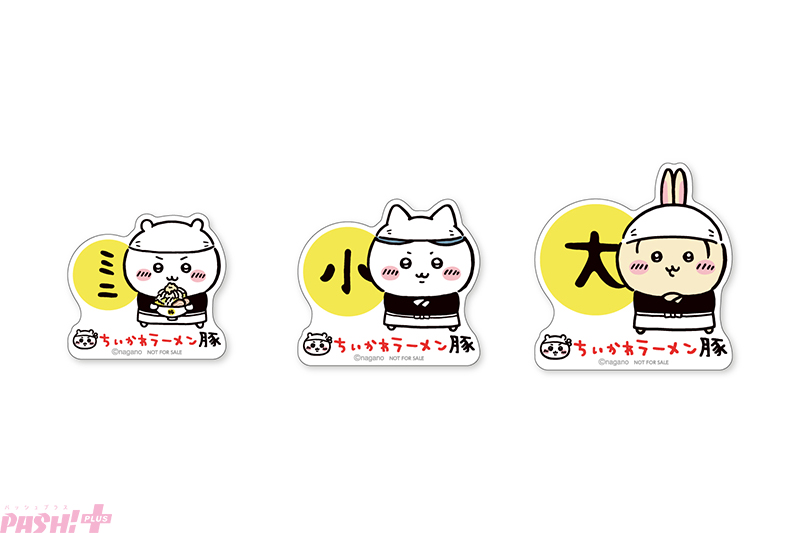 ラーメン豚はサイズをお選びください。ミニはちいかわ、小はハチワレ、大はうさぎがご提供。それぞれのキャラクターを模ったはんぺんを盛り付け。お好みをコールでお伝えください。また、ラーメン注文特典としてノベルティステッカーをお渡しします。