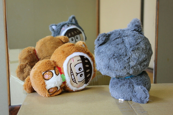 こちらの画像は、おそ松とカラ松の写真です。鏡に映る自分に見とれるナルシストキャラのカラ松。そこにやってきたおそ松が、「いつまで見てるわけ~?」と、カラ松の顔をのぞき込むような会話が想像できるのではないでしょうか。