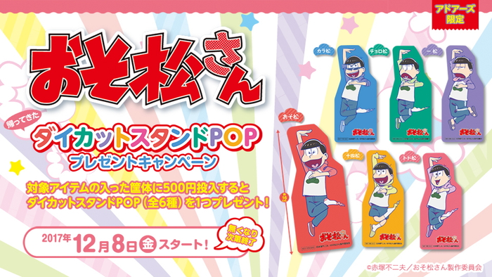 12月8日より、アドアーズ限定で『おそ松さん』プレゼントキャンペーンが実施! 対象アイテムの入った筐体に500円投入すると、ダイカットスタンドPOP(全6種/約16cm)のいずれか1つが先着でもらえます(※種類は選べません)。