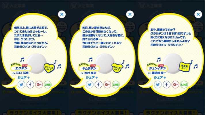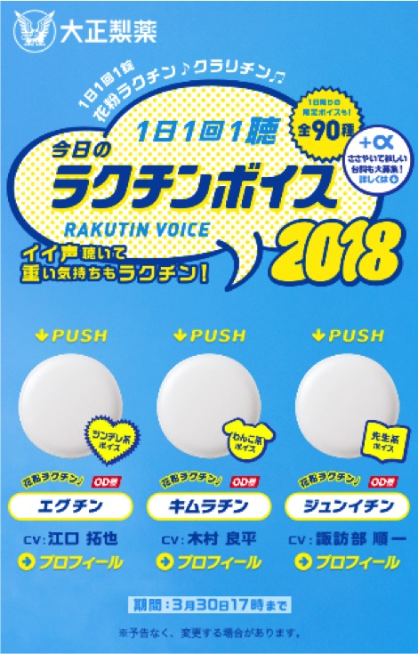 このサイトでは江口拓也&木村良平&諏訪部順一の3名による、合計90種類のオリジナルボイスをお届け。ボイスは、1日1回1錠を服用することで効果を発揮するアレルギー専用鼻炎薬「クラリチンⓇEX OD錠」の用法・用量と同様に、人気声優のささやきを1日1回だけ聴くことができる期間限定サイトで、“1日1回1聴”の仕様となっている。