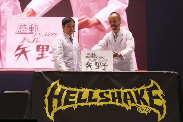 この日一番異彩を放っていたヘルシェイク矢野。アニメ『ポプテピピック』の挿入歌『Hell Yeah!!』を披露するということでしたが、登場したのは白衣に身を包んだAC部の2人。そしておもむろに取り出したスケッチブックをめくり、「感動ドキュメンタリ ヘルシェイク矢野」の高速紙芝居がスタート!
