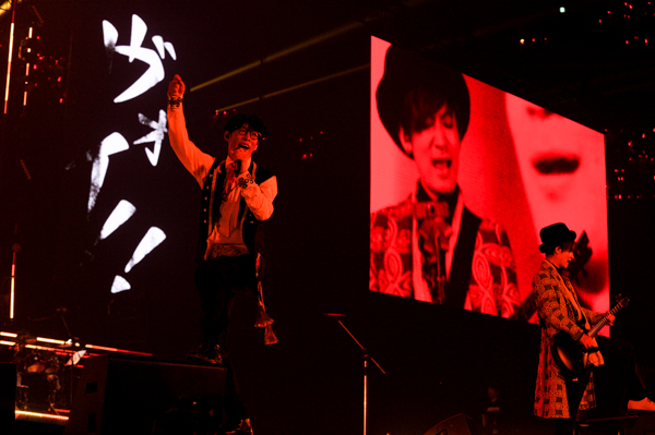 左肩にスカルホーンを乗せた衝撃的な姿で登場した蒼井翔太さんのステージは、『零』からスタート。和楽器とロックが融合したこの曲を情感たっぷりに歌い上げます。