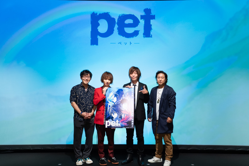 舞台にも出演するヒロキ役の植田圭輔に続き、司役の谷山紀章、悟役の小野友樹、林役の加瀬康之が登壇。『pet』のアニメに出演することに対して、谷山紀章はもともと原作のファンであったことを明かし、原作ファンの期待を裏切らないこと、新規ファンにも楽しんでもらいたいと意気込みを語った。小野友樹は、担当する悟について、「外見は強面だけどいろんなことに怯えている」とキャラクターの二面性を指摘。「作品の中でも大切な役割を担っている」と自身の見解を述べた。