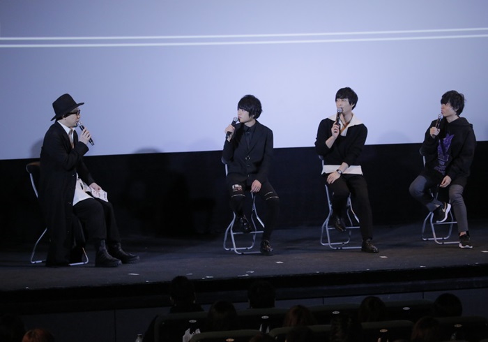 テレビアニメ放送終了から約1年経過した12月1日、ついにあの猛き戦いがスクリーンにて蘇るとのことで、上映会のチケットは即時完売。当日は全編上映の前にキャストによるトークショーが行われ、大歓声の中、堀江 瞬(寝住役)さんをはじめ、梅原裕一郎(失井役)さん、岡本信彦(憂城役)さん、そして安元洋貴(ドゥデキャプル役)が登場し、ドゥデキャプルの「エブリバディクラップユアハンズ!」の声でイベントがスタートしました。久しぶりに集合したキャスト陣は、作品の振り返りや、これから鑑賞する本編のみどころを語りました。