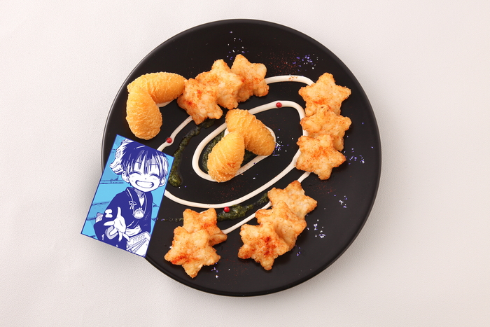 捻子型チョコがポイントの“夏彦のルームサービスココア”、ブルーシロップにライチソーダの組み合わせに爽やかに浄化されてしまいそうな“輝の聖なる(ホーリー)エクソシストブルーソーダ”など、キュート&個性豊かなフード&ドリンクが登場。