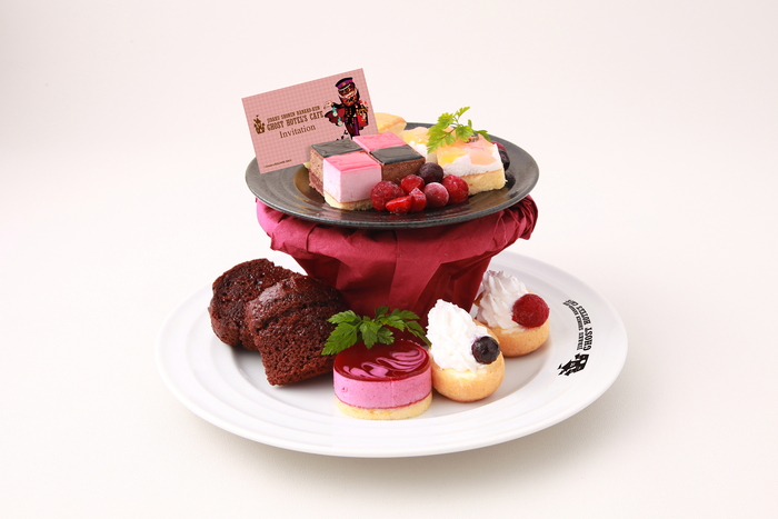 GHOST HOTEL’S CAFEへの招待状付きアフタヌーンティーセット。たくさんのケーキがのっているのでシェアにおススメ☆