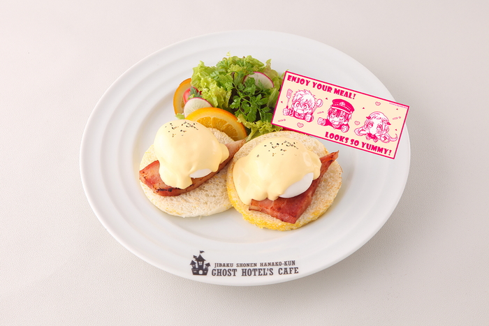 光が花子くんと寧々のために初めて作ったエッグベネディクトです。半熟ポーチドエッグと厚切りベーコンがのっています。