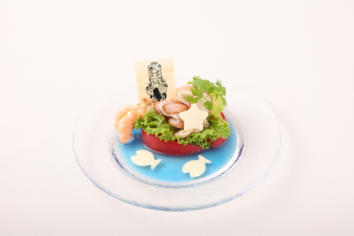 人魚の鱗を飲んで人魚界のプリンセス!?になった寧々をイメージした、青いドレッシングが美しいマーメイドサラダです。