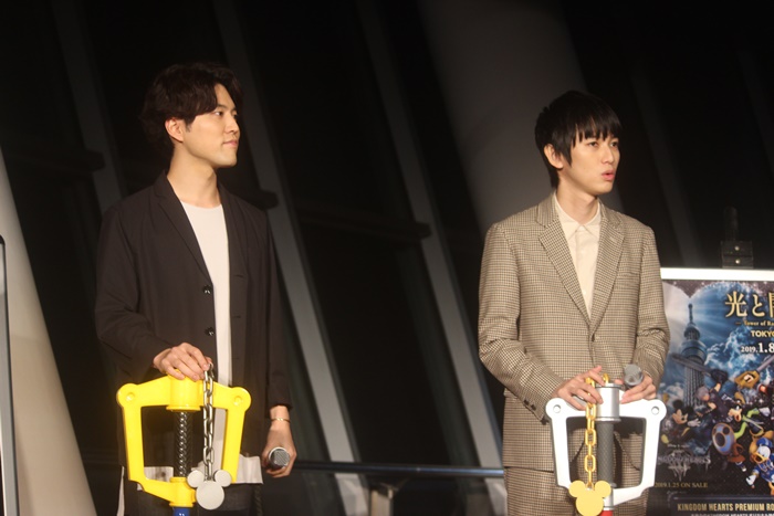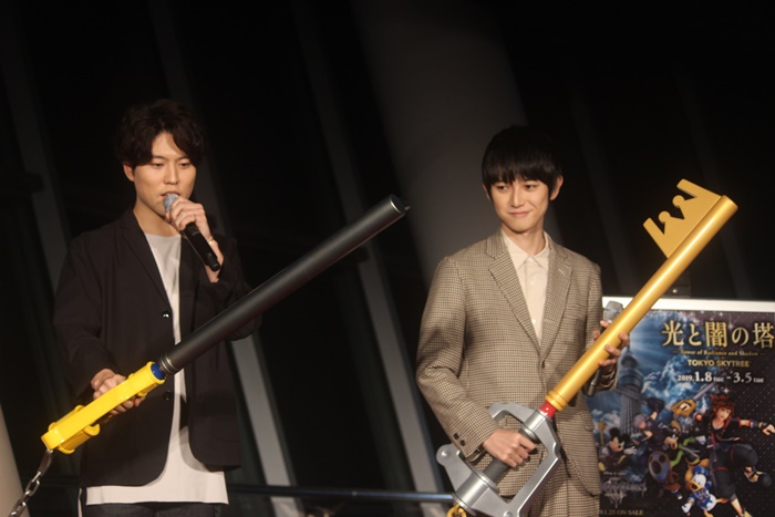 司会の方の呼び込みを受けると、入野さんはソラのキーブレード、本郷さんは王様のキーブレードを持って登壇。入野さんは「人前にもって出る機会はなかなかないので恥ずかしいです(笑)」と照れ笑いを浮かべていた反面、本郷さんは「ゲームファンとしては本物を持てたことが嬉しい!」と興奮気味にキーブレードを抱えていた。