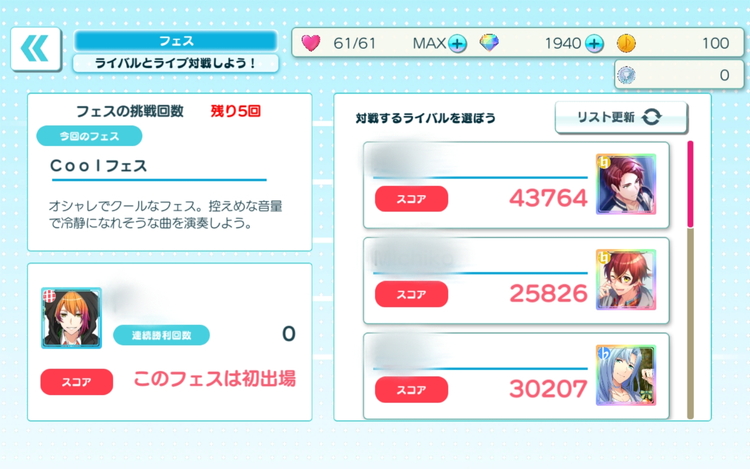 1日5回行える対戦形式のライブです。フェスもライブ同様属性がカギとなっているほか、フェスを行うごとに変わるので都度ユニット編成を変えるのがオススメです。勝てるか自信がない人は、スコアが低めのライバルを選んで対戦すると勝てる確率が上がります!