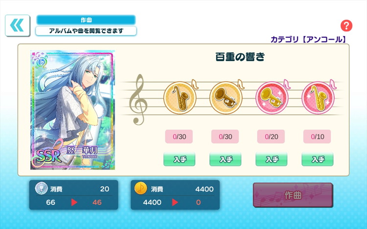 曲は作曲で増やすことができますが、作曲に必要なアイテムもライブでしか手に入らないので、ライブのプレイは必須です!