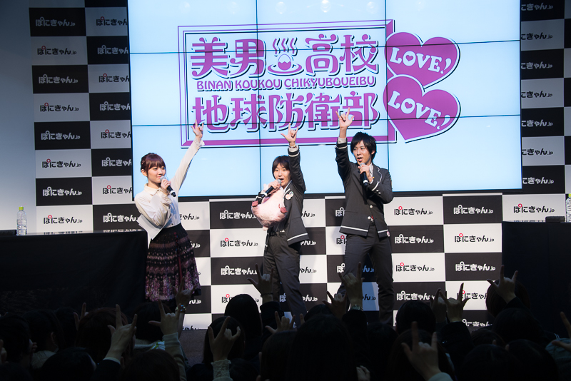 発売中の防衛部5人が箱根や鬼怒川に行った様子が見られる特典映像付きの防衛部1期シリーズBD&DVD全6巻や、5月3日(火・祝)発売のライトノベル『美男高校地球防衛部LOVE!NOVEL!II』、「きゃにめ.jp」にて予約受付中の新作グッズ・フルカラーバスタオル(完全受注生産)、防衛部5人が出演するニコ生『バトルナマァーズ』が4月に配信されることを告知し、最後に2人アニメ第2期を楽しみに待っていてほしいとメッセージを送った。