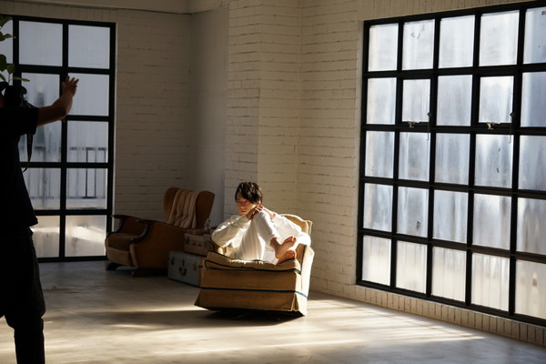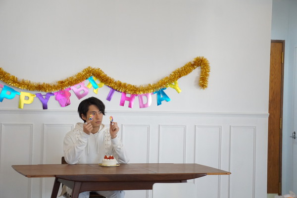 全身白のスタイリング、いつもより少しオデコが見えるヘアスタイルで撮影しました。室内では裸足でポーズをとっていただいたり、外では白のマフラーを添えたり、さまざまなバリエーションがあります。CDリリースと3月8日のお誕生、両方を祝って、ショートケーキと一緒のお写真も!