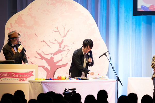 イベントのテーマが「SMILE」ということで、ファンを笑顔にする仕掛けが多数! 今回はそのなかで行われた、タイトルの垣根を超えた「PARTY STAGE」第1部の様子をお届けします。このステージでは、タイトルの垣根を超え、イケメンシリーズのキャラクターボイスを担当する声優陣がトークやゲームで楽しませてくれました。