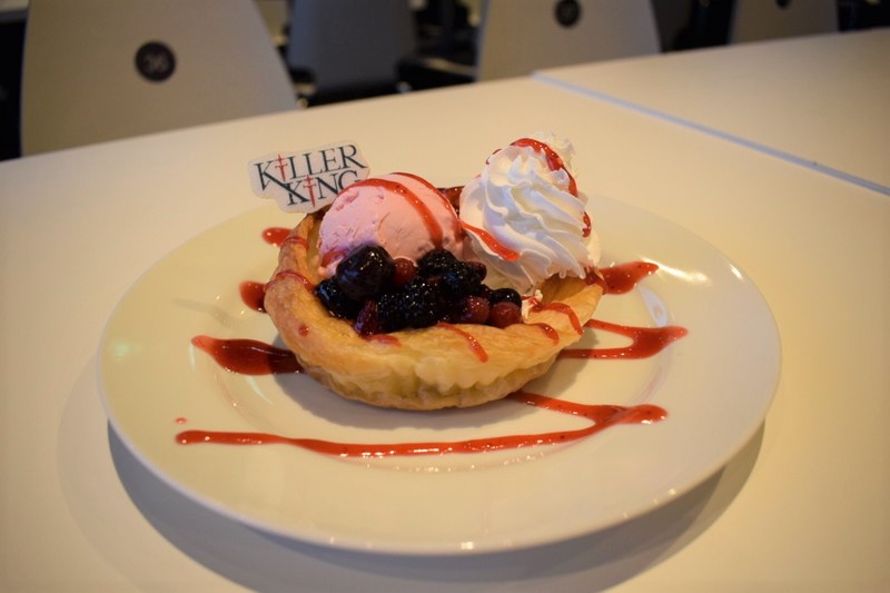 KiLLER KiNGをイメージしたデニッシュスイーツ。濃厚な生クリームとストロベリーアイス、甘酸っぱいベリーがトッピングされていて、見た目もキュート♪ ナイフで一口大にカットしたデニッシュに絡めていただきます。