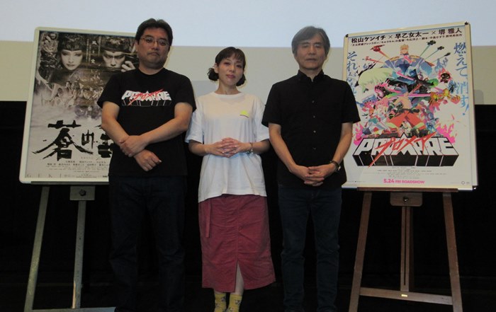 松山ケンイチ、早乙女太一も同舞台に出演しており、『プロメア』の主人公ガロとリオのキャスティングに際しては、本作や、同じく2人が共演したWOWOWの土曜オリジナルドラマ「ふたがしら」(2015)での演技が念頭にあってオファーがなされました。様々な繋がりと、ファンの熱狂的な盛り上がりと熱量によって実現した今回のコラボ上映イベント、『蒼の乱』上映後に、『プロメア』監督の今石、中島かずき、ルチア・フェックス役の新谷真弓が登壇すると会場からは割れんばかりの拍手が起こりました!