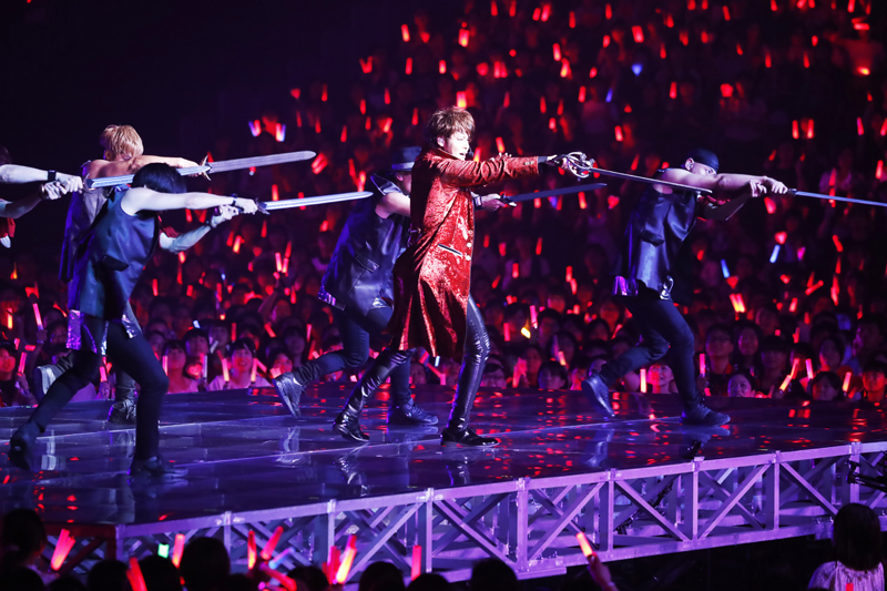 続いて歌唱した『VOICE』では、ムービングステージがせり上がり、客席のテンションは一気に上昇。ダンサーたちとの息の合ったダンスと男らしいクールな表情でファンを魅了していく。さらにダンスナンバーは続き、『EGOISTIC』では剣を使ったパフォーマンスを披露。力強さと美しさを兼ね備えた剣(つるぎ)の舞は、会場を大いに沸かせた。