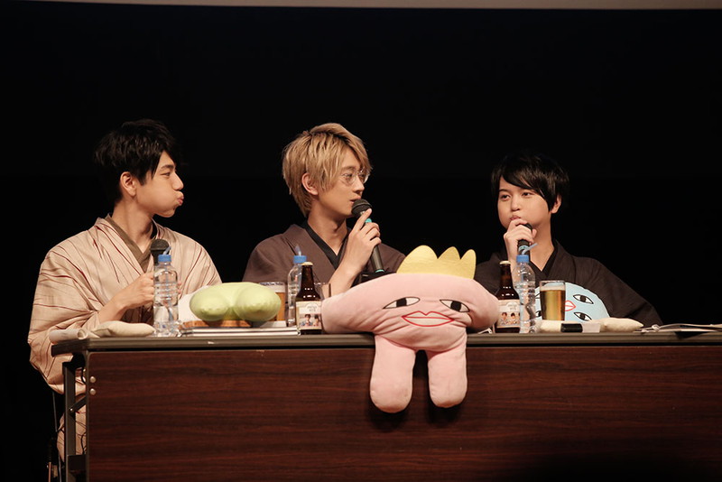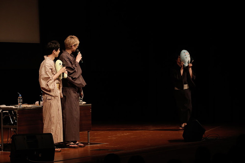 番組ナレーションを担当する斉藤さん&観客による「拓也さーん!」「宏ちゃーん!」の掛け声にあわせて、江口さん&西山さんが浴衣姿でステージに登壇。いつもは2人と一緒に登場する癒し大王(のぬいぐるみ)は、「落ちるから」という理由でステージ上の机に縛り付けられており、イベント中、独特の存在感をかもしだしていた。