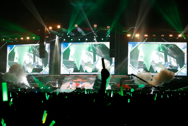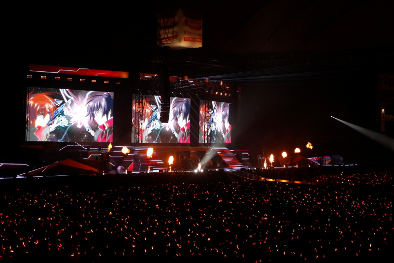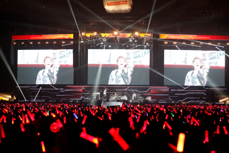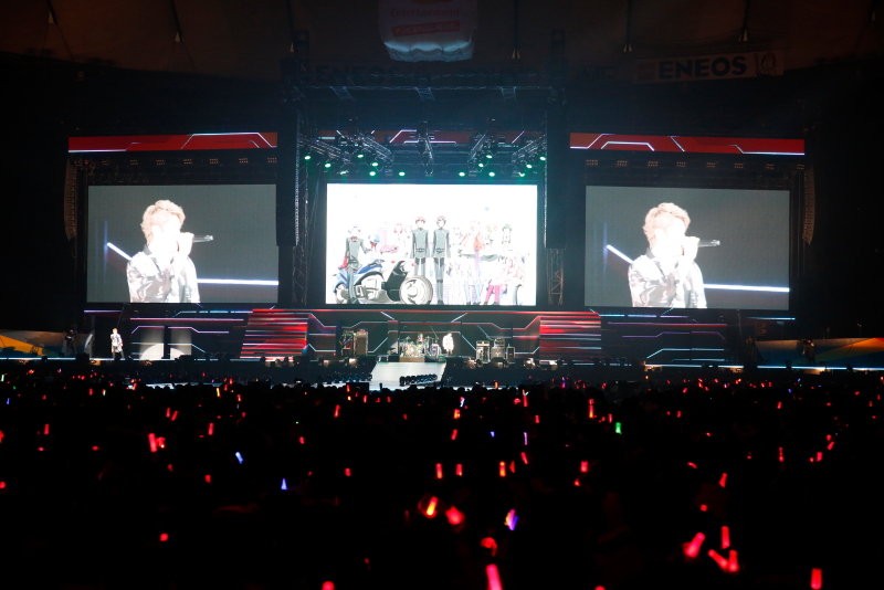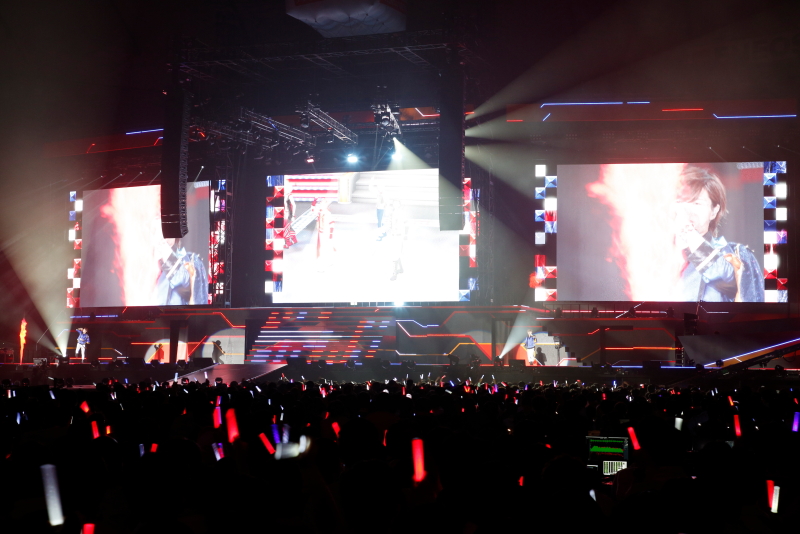 続いてFLOWが登場。船が出港する映像とともにメンバーがステージに立ち、「行くぞ東京ドーム!」と『テイルズ オブ ベルセリア』の主題歌である『BURN』を披露。会場のペンライトとステージから立ち上る炎で、会場の勢いはさらに高まっていきます。