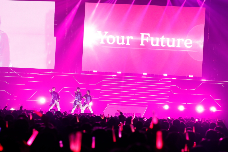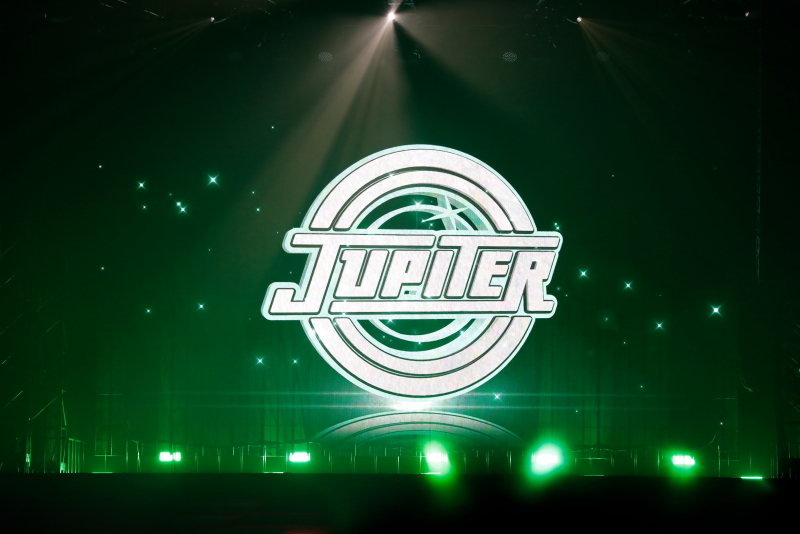 S.E.Mの『Study Equal Magic!』で会場も一体となった振り付けで盛り上がったあと、Jupiterの大きなロゴが映し出されます。3人がステージに立つと歓声と緑一色のサイリウムに包まれました。『BRAND NEW FIELD』の曲中でマイクを客席に向けたり、客席に笑顔を向けたりする仕草はまさにJupiterでした。神原さんが「忘れられない夜になったかな?」、寺島さんは「東京ドームなんて楽勝、だぜ!」とセリフを変えて観客を沸かせ、今日だけの特別な演出を見せてくれました。
