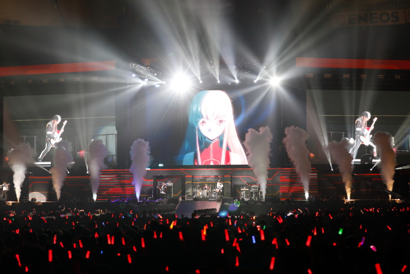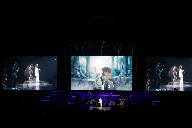 『コードギアス 反逆のルルーシュ』オープニングテーマ『COLORS』では、サビで客席も一緒に大合唱! ギターソロでギタリストがセンターステージへ駆け出し、観客を沸かせました。ラストは「日本のアニメ、全員で盛り上げていこうぜ!」と呼びかけ、『コードギアス 反逆のルルーシュR2』のオープニングテーマ『WORLD END』へ。最初から最後まで熱気のやまない、大盛り上がりのステージでした。
