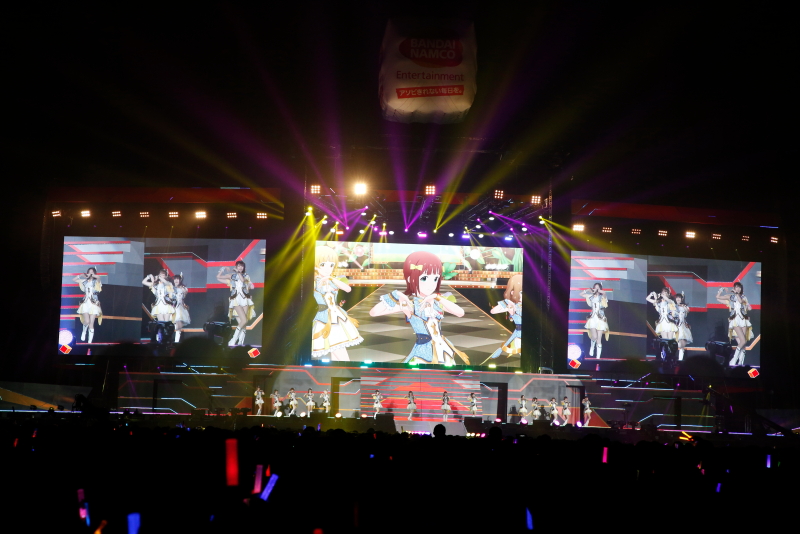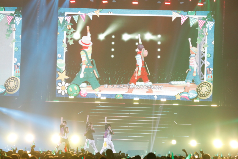 16時定刻に照明が落とされると、色とりどりのペンライトで会場がきらめき始め、トップバッターは『アイドルマスターSideM』が登場! おなじみの曲『Beyond The Dream』では「315!」と会場と声を揃え盛り上げていきます。