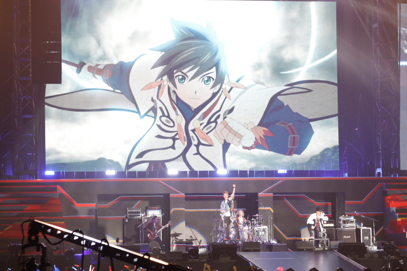 「拳を上げてくれ!全員で一つになろう。」と、アニメ『テイルズオブゼスティリアザクロス』のオープニングテーマ『風ノ唄』へ繋ぎます。赤から一転して、青の照明とペンライトに変わり会場は一体感に包まれます。そのまま『テイルズオブゼスティリアザクロス』のエンディングテーマ『INNOSENSE』へ! 腕を振り上げ、会場を盛り上げる重厚で激しいロック曲が続きます。