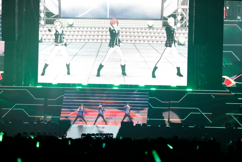 続いてFRAMEの3人がユニット曲『勇敢なるキミへ』を披露。「呼んでくれよ」と歌うと会場全員が大きな声で「FRAME!」と名前を呼んでいました。神速一魂は『バーニン・クールに輝いて』をセンターステージで互いの腕を交わしながら熱く披露。