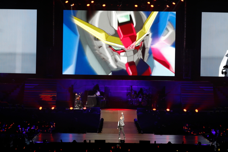 『機動戦士ガンダムSEED DESTINY』エンディングテーマ『Reason』では、オフショルダーの赤いきらびやかな衣装でダンスを踊り、当時と変わらぬ姿を魅せていました。「(デビューから)16年も経ったんですよ!」と語り、第4期オープニングテーマ『Realize』へ。センターステージに移動しながら会場を盛り上げました。