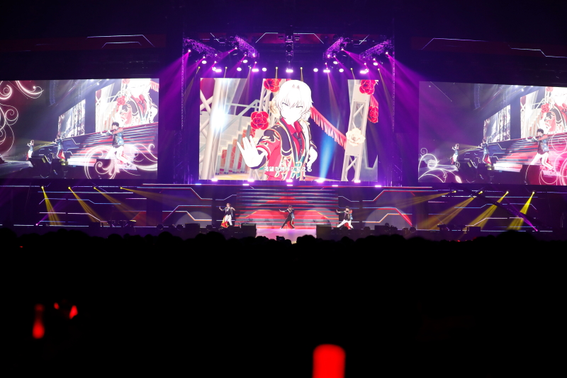 『永遠なる四銃士』ではPVと同じく剣を持って4人が登場! 青と赤のペンライトに彩られ美しい演出に。4人が四分割画面で大きく映し出されると歓声が湧き起こりました。