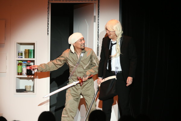 物語の途中、TOSHIが舞台上に1人になる場面が。それまで持っていたほうきを置いて椅子に座ると、飾り棚に置かれていたビールを飲みだします。ちょうどそこにひじりが戻り、ビール缶を手にするTOSHIを目撃。ひじりをこの屋敷の主人だと思っているTOSHIは視線を合わせたままそっとビールを持った手を下におろし、アドリブバッグの中に缶を隠します。