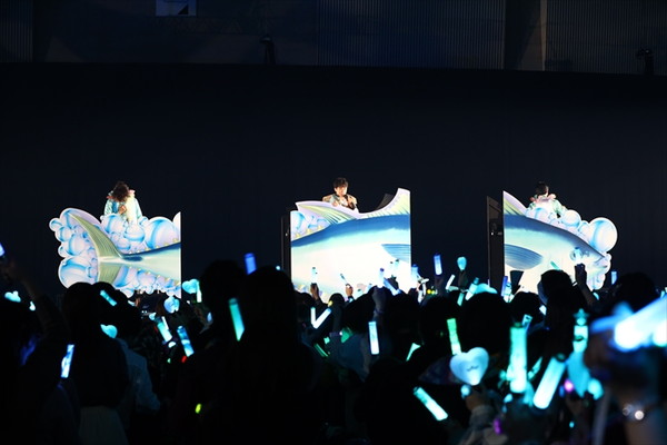 そして、「ミュージックレディースパーキング!」の掛け声によりライブがスタート。トップバッターは、涼野ユウ役の内田雄馬による「Shiny Stellar」。花道に躍り出ると所狭しとキレのあるダンスを披露した。続く「Sailing!」では、鷹梁ミナト役の五十嵐 雅がカツオを模したトロッコで登場。西園寺レオ役の永塚拓馬が可愛らしく強く歌い上げた「Twinkle☆Twinkle」では、会場がピンクに染まった。