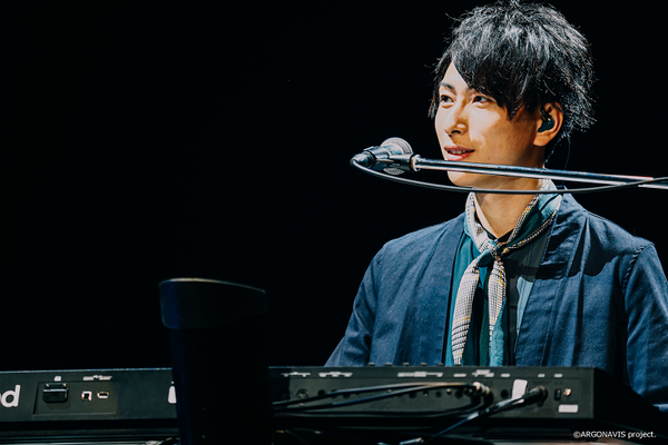 密やかなイントロから『流星雨』へ。思い悩む結人とArgonavisを繋いだ大切な楽曲だ。流星のような照明とミラーボールがきらめくなか、伊藤と日向がしっとりと声を重ね、森嶋は華麗なソロで魅せる。すぎた日を思い起こすように伊藤は目を閉じ、祈るように歌い上げた。