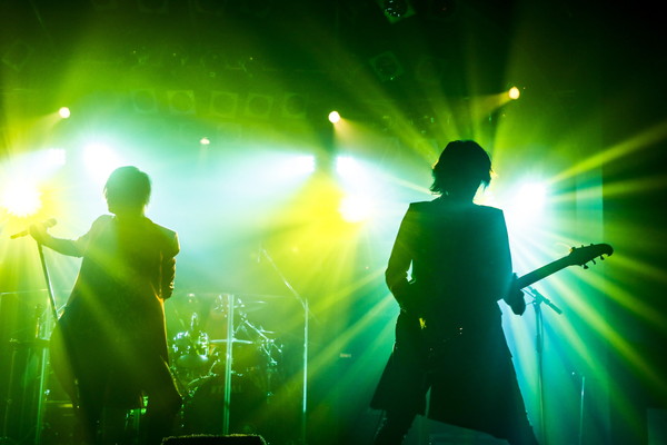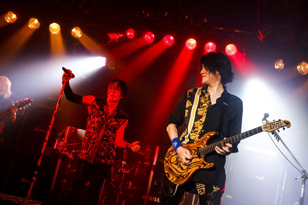 そして開演の19時半。暗転したステージに、映画のオープニングを思わせるような壮大なBGMが流れ出す。赤い照明が満ち、KISHOW、e-ZUKA(Gt.)とサポートメンバーの瀧田イサム(Ba.)、SHiN(Dr.)が登場。シルエットとなって、いつものポジションにスタンバイする。
