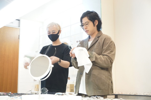接客することを想定したシーンでは、再びジャケットに袖を通します。店員さんからメガネのレンズの拭き方をレクチャーされ、商品のメガネをひとつずつチェックしていく白井さん。真剣な表情の白井さんは自分が作ったメガネを吟味する職人そのもの。そんな職人な白井さんを見たい方はぜひ本誌で!