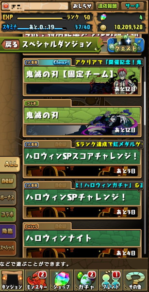 ライターN:次は、スペシャルダンジョンで遊んでみましょう。メニュー「ダンジョン」から「スペシャル」に行くと、「鬼滅の刃【固定チーム】」と「鬼滅の刃」の2種類を遊べます。