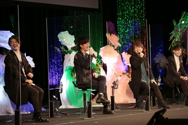 本イベントのために描き下ろされたイベントビジュアルの雰囲気に合わせ、フォーマルな出で立ちで登場したのは、櫻井孝宏(リチャード・ラナシンハ・ドヴルピアン役)、内田雄馬(中田正義役)、松風雅也(ジェフリー・クレアモント役)、井口祐一(下村晴良役)、そしてMCの柳原哲也(アメリカザリガニ)。櫻井は「しっとりと、素敵な時間を過ごせたらと思います。ただ終わる頃にはどうなっているか分かりません(笑)」と冒頭の挨拶から会場の笑いを誘い、内田も「今日はみんなの気持ちをひとつにしてイベントを楽しみましょう!」と和やかな雰囲気でスタート。