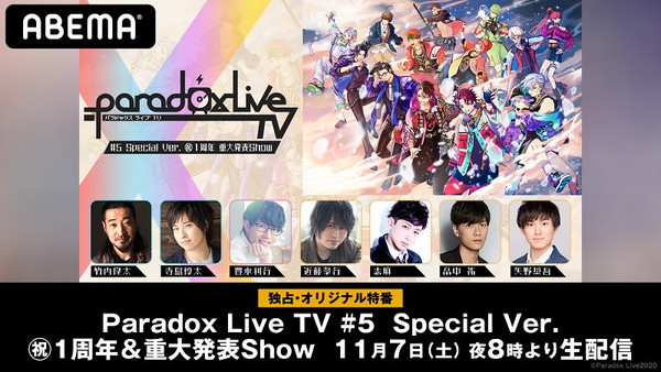 『Paradox Live』1周年記念特番が11月7日(土)に行われ、竹内良太、寺島惇太、豊永利行、近藤孝行、志麻、畠中 祐、矢野奨吾の7人が出演。4大発表が行われ、ファン待望のライブステージを含む配信イベント開催が決定した。