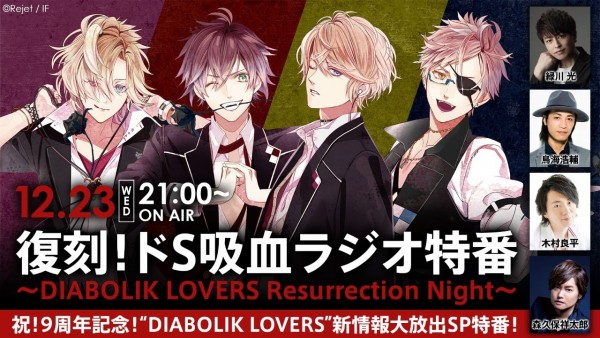 『DIABOLIK LOVERS』キャストが送る「ドS吸血ラジオ」が2020年12月23日に特番で復活! その名も「復刻!ドS吸血ラジオ特番~DIABOLIK LOVERS Resurrection Night~」。9周年を迎えたばかりのディアラヴァの新情報や、この日限りの特別な朗読など内容盛りだくさんの放送を振り返ります。