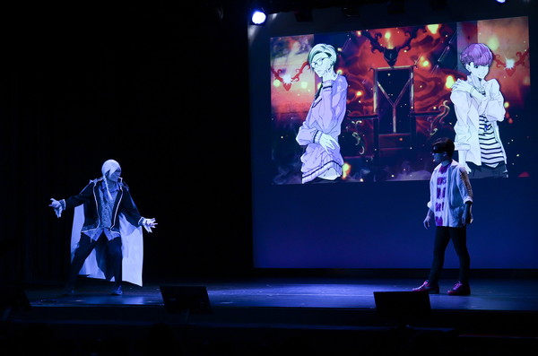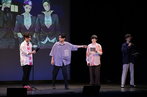 セットが入れ替わると、「宝石を盗まれた!」というナレーションが会場に響き渡ります。ステージには阿座上さん、熊谷さん、天﨑さん、梶原さんが揃い、向さんから出されたお題に応える、完全アドリブコントへ。宝石を盗んだ犯人は怪盗スベルパンは変装の名人でこの4人の中にいるという。そして、なんでもスベルパンは「とにかく面白くない、スベリまくる」らしく、向さんの出す、笑いを求める質問に一番ウケなかった者…それが、スベルパンという設定。「このラーメン屋には二度と行きたくない!その理由は?」「この人、隠しているけど実はオタクだと思う瞬間は?」などの大喜利や無数の小道具からボケを繰り出すモノボケに挑戦し、アドリブで回答が続々と飛び出す中、梶原さんの回答だけが趣旨とズレすぎていて観客だけでなくキャストさえも爆笑させ、相方の天﨑さんに「ベツ・ジゲン」と名付けられるシーンもありました。果たして、この4人の中に「スベルパン」は潜んでいたのでしょうか…?