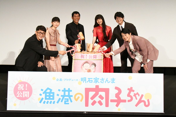 あっと言う間にイベント終了の時間が迫り、映画を楽しみにしているファンへ向けて、まずCocomiが「一人でも多くの方に映画を楽しんで頂いて、心の栄養にしてもらえたら嬉しいです」、花江は「笑って泣いてそしてお腹が空く、そんな素敵な映画です。色んな人と肉子ちゃんを観て、幸せな時間を共有して頂けたらと思います」、石井は「夢だった声優のお仕事が出来て、この場に立たせてもらえたことが本当に嬉しいです。今日はありがとうございました!」、下野は「本当に感動できる作品になっていると思います。劇中の小さな生き物たちを様々な方が演じていらっしゃいます。そんな生き物たちにも目向けながら、楽しんで貰えたら嬉しいです」、渡辺監督は「制作をスタートさせてからこの日を迎えるのが目標でした。多くの作品に携わってきましたが、こんなに寂しいのは初めてです。この場を借りて、さんまさんにこの作品を作らせて頂いたことに改めて感謝を述べたいと思います。ありがとうございました」、そしてさんまが「MISIAさんから関根勤さん、小堺一機さんなど僕が信頼している多くの方から面白いと言って頂けました。主題歌「イメージの詩」のオリジナル版を歌っている吉田拓郎さんは、映画版主題歌を聞いてワンフレーズで号泣したと言っていました。これだけ嬉しいコメントを寄せてもらって本当に満足です。ちなみに小堺くんが“お腹が減って、心がいっぱになる映画です”と言ってくれたので今後はこれをキャッチコピーにしたいと思います(笑) 。生中継をご覧の皆様もありがとうございます!これから2回、3回と観て貰えたら嬉しいです」と著名人を始め、すでに本作を観た観客からたくさんの温かい言葉が集まっていることに感謝の言葉で締めくくり、最後に登壇者全員で笑顔いっぱいの肉子ちゃんとキクコのイラストがあしらわれた樽を用いて公開記念の鏡開きもにこやかに終え、大盛況のまま舞台挨拶は終了しました。