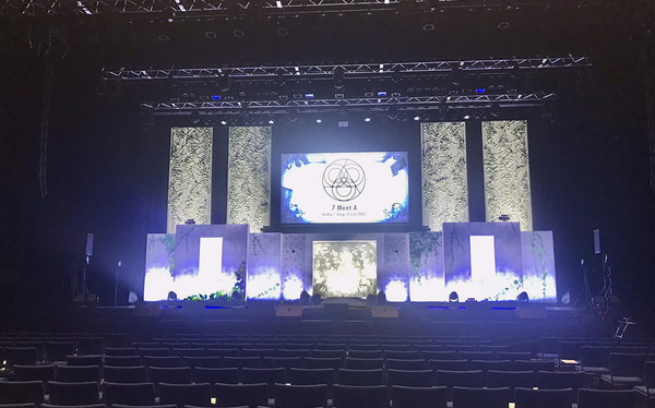ステージ装飾は様々な色の照明が映えるよう白を基調とし、真ん中には花のオブジェが。