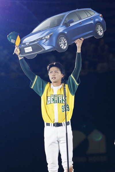 まずは城田コミッショナーから各賞の受賞者を発表。守備で魅せた「ファインプレー賞」はDB上田堪大。会場を盛り上げた「ハッスル賞」はDB鳥越裕貴。観た人を幸せにした「ハーゲンダッツ賞」はBW阿部顕嵐。“この夏、観客を甘酸っぱい思い出でほろよいにさせた”という理由で「ほろよい 夏の白いサワー賞」はゲスト解説の荒牧慶彦に贈られた。そして「MVP」は試合を決定づけたタイムリーを放ったDB岩瀬が受賞。トヨタのカローラが贈られると、「免許を持ってないので今から免許合宿に行ってきます! ありがとうございました! 練習でホームランを打ったので本番でも打とうと思ったんですけど、左中間に…、ちょっとね…、ナイスバッティン!」と喜びを爆発させた。
