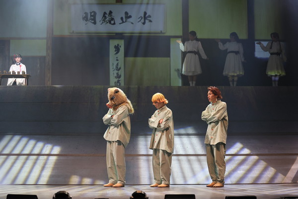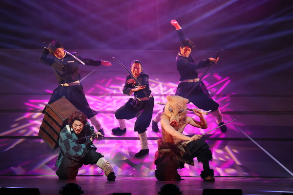 劇中では、キャラクターが歌うミュージカルのようなシーンがところどころに挟まれている。那田蜘蛛山で行われた伊之助の戦闘シーンでは彼の好戦的な様子を表したロック調の曲、機能回復訓練でのシーンでは蝶屋敷の楽しくにぎやかな様子を表現した曲など、各シーンで使われる音楽もまた、舞台の世界観を深めていた。なかでも注目なのが、和風な曲調のオリジナルメインテーマ。壮大で力強く、それでいて悲壮感があり、舞台上でのパフォーマンスも相まって非常に印象深い一曲となっていた。キャストの歌唱力も圧倒的だ。
