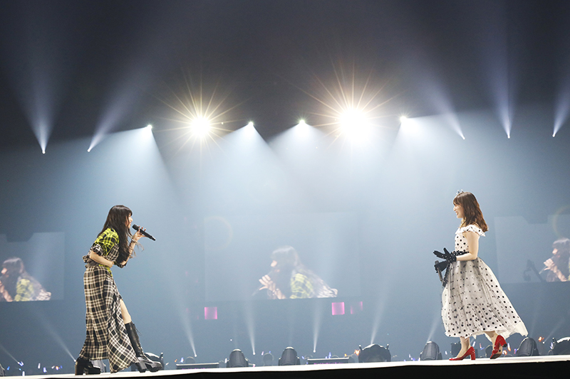 MCに入ると雨宮天さんが登場し、コントのような掛け合いを挟んで2人のコラボによる『君のせい』がスタート。ハイテンポな曲調に加えて、2人がそれぞれトロッコに乗るパフォーマンスで会場のテンションも上がり、クラップが鳴ります。