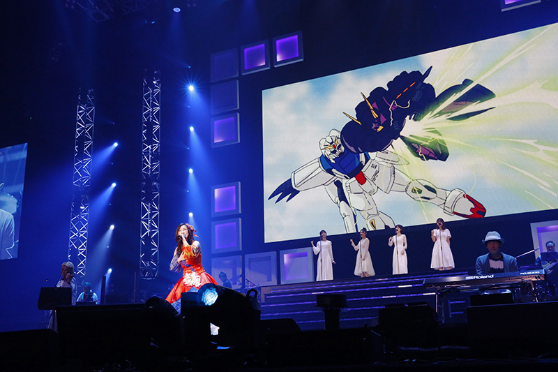 『ETERNAL WIND ~ほほえみは光る風の中~』は“森口博子 feat. NAOTO&酒井ミキオ with Healer Girls”の形でアニメ映像とともに熱唱。作品を見ている人には感動せずにはいられないパフォーマンスで熱狂のうちに前半を締めくくりました。