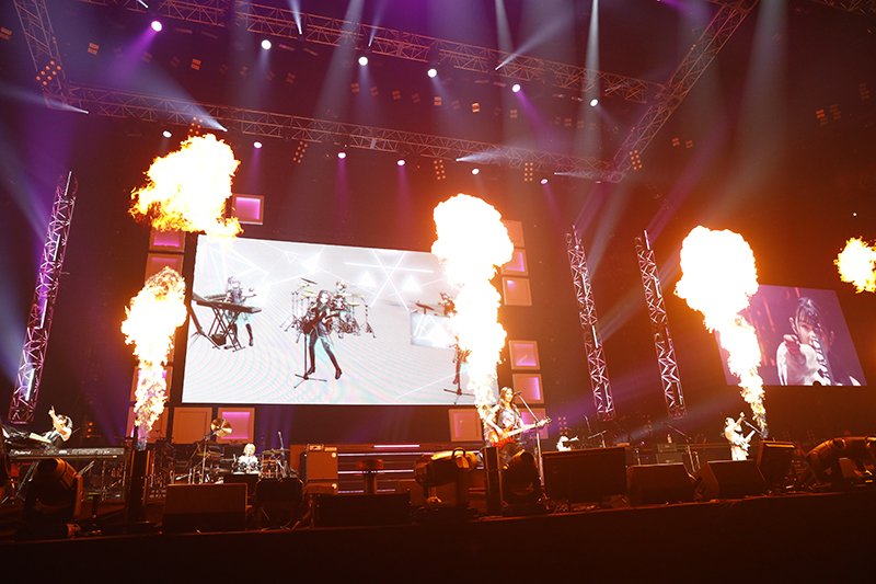TVアニメ『アサルトリリィ BOUQUET』のアニメを使用した演出が終わるとRAISE A SUILENがステージに。迫力のバンドサウンドで『Sacred world』を演奏すると会場のテンションもさらに上がります。『R・I・O・T』、『EXPOSE』とパフォーマンスが進むごとにボルテージは上昇していき、ひと際大きなクラップや拍手が鳴り響きます。