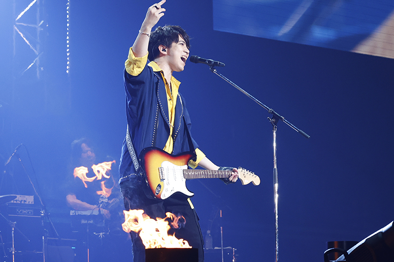 アニメ映像を使った小芝居の後は、“SHOW BY ROCK!!”のパフォーマンスがスタートします。最初に現れたのは自転車に乗った“DOKONJOFINGER”のヤス役・伊藤健人さん。『移動手段はバイクです』を火柱の演出に負けない勢いで熱唱すると、会場からもクラップが上がります。