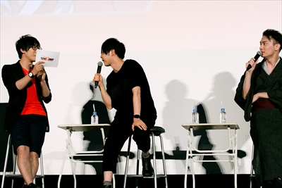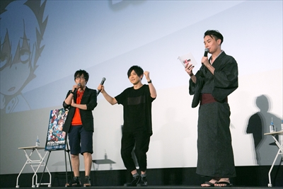 オープニングトーク後、メインイベントである先行上映が終わると再び3人が登場。上映中に着替えを済ませた梶さんが、着ぐるみについてツッコまれたりと、賑やかにトークコーナーに入って行きました。